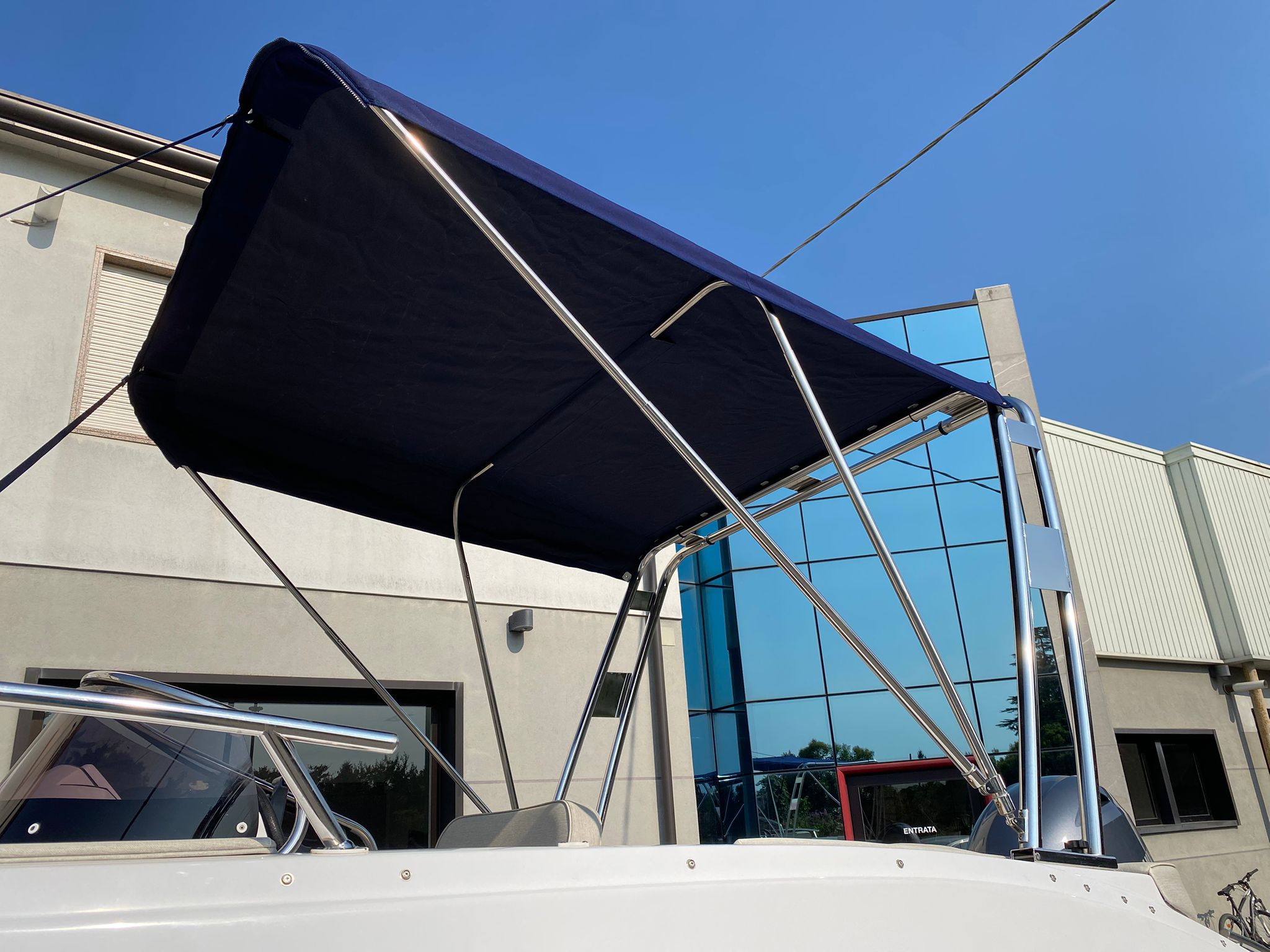 - Rollbar + Tendalino in acciaio inox con tela in Sunbrella di colore blu + Estensione tendalino a prua